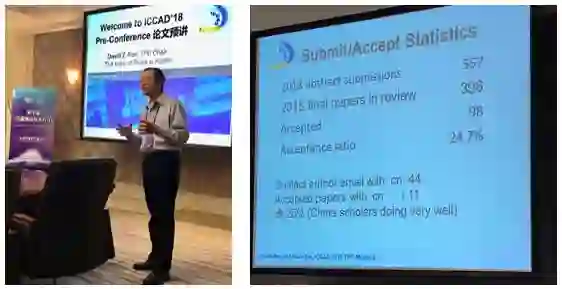ICCAD论文预讲论坛:上海交大的蒋力副教授和浙江大学的卓成教授组织了集成电路领域顶级会议ICCAD的预讲,今年ICCAD程序委员会主席,UT Austin大学的David Pan教授为预讲会议开场。今年ICCAD接受率在25%左右,共计98篇论文入选,其中来自国内的研究团队共有11篇论文,占总接受数的11%。预讲会议为国内EDA领域的学者提供了交流平台,收到了各个院校及研究所的大力支持,共十个研究团队参加了预讲会议,并就他们的工作做了精彩讲解。其中深度学习依然是研究热点,来自北大(2篇)、清华、上交(3篇)及中科院的团队分别就器件、算法、架构及框架等多个给层次进行了深刻的剖析和讨论。其他团队包括浙江大学、西北工业大学和复旦大学等团队则更着眼于传统EDA领域就硬件安全性、数据重用性、近似计算、电源及物理设计等方面针对低功耗、高能效的目标提出了一系列新颖的优化解决方案。预讲会议作为介绍国内EDA领域工作的一个窗口,不仅给ICCAD入选论文的相关团队提供了交流讨论的平台,也受到容错领域设计、器件及架构等相关研究团队的关注,就多个话题展开了切实而热烈的讨论,参会各方都受益良多。从最近几年ICCAD接受的论文来看,人工智能技术已经在EDA领域有了越来越广泛的应用,对进一步提升设计的自动化能力提供了有力的技术手段。
