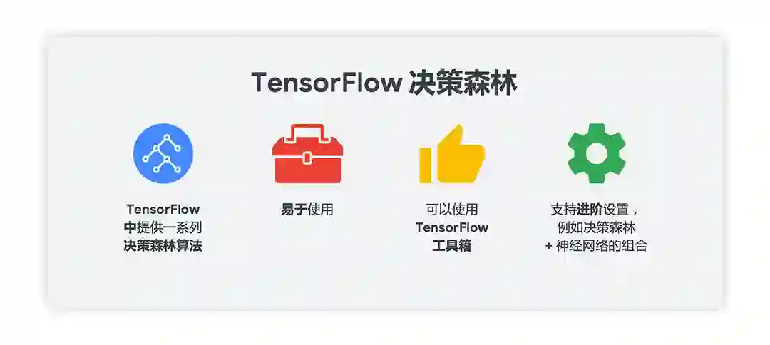 另外,在TensorFlow 为开发者打造的TensorFlow 决策森林 (TensorFlow Decision Forests, TF-DF) 中,丰富的工具和模型让开发者也可以轻松地跟 TensorFlow 工具、库以及 TFX 等平台组合使用。