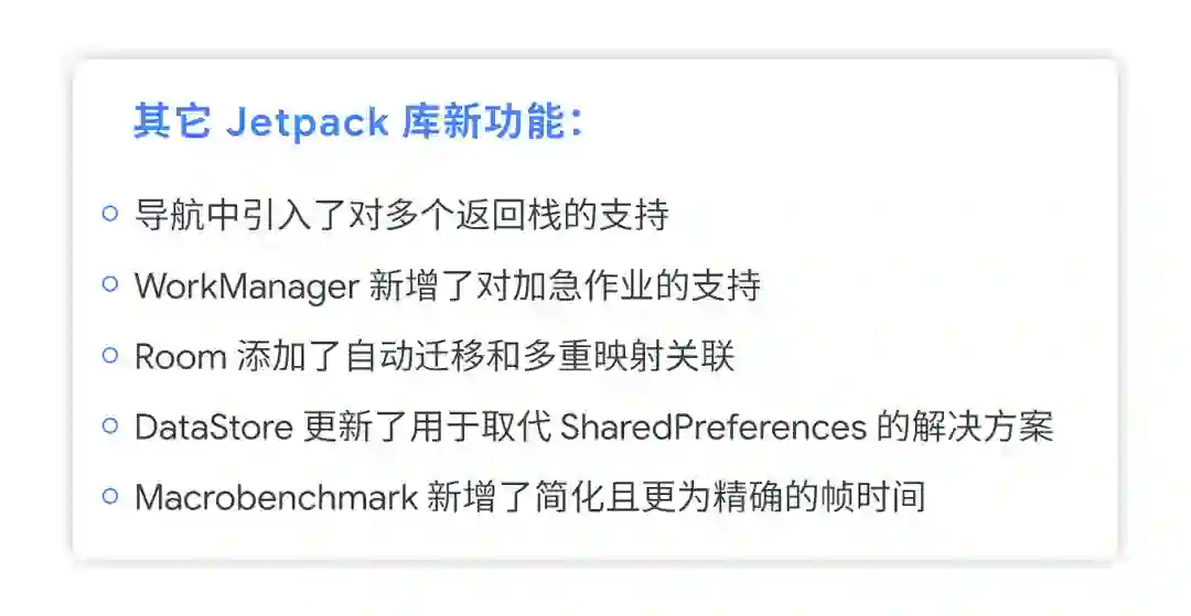 除此之外,在其他的 Jetpack 库中,还增加了许多大家建议的新功能,比如导航中引入了对多个返回栈的支持、WorkManager 新增了对加急作业的支持,让处理 Android 12 后台限制变得更加简单、Room 添加了自动迁移和多重映射关联等。为了让 Android 的开发工作变得更简单、快捷,谷歌还推出了 MAD 开发工具,助力开发者更高效地开发。
