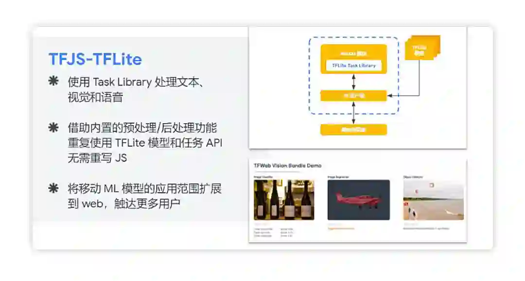 而除了能够快速帮助开发训练出各种复杂模型之外,很多开发者还深受环境部署之痛。为了帮助开发者将模型部署到不同设备上,TensorFlow 生态中提供了多项工具,例如 TensorFlow Lite,这一针对移动和嵌入式设备的轻量级解决方案就可以构建具备机器学习功能的原生移动应用;TensorFlow.js 不需要环境设置就可以在任何支持 JavaScript 的环境中运行模型。此外,TensorFlow.js 已经支持 TensorFlow Lite 模型,可以更加高效且便捷地助力开发者们在 Web 环境中高效开发。