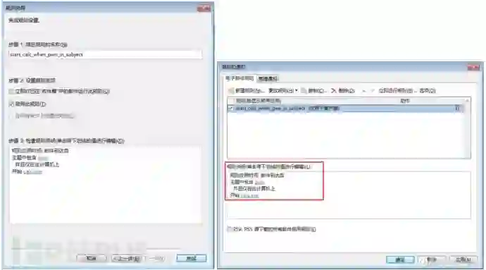 手动新建一个规则及其触发动作,当收件主题中包含 ”pwn“ 时,启动计算器程序(calc.exe)。