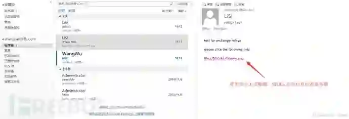 随后,攻击者给目标用户发送钓鱼邮件,邮件内容包含一个恶意外链,该链接可以是指向攻击服务器80端口上的Web Server,或者是指向攻击服务器上的SMB共享,当用户点击该链接时,当前用户的NTLM认证将被发往攻击服务器,攻击服务器取得该Net-NTLM哈希时,将其重放到真实Exchange服务器以访问EWS接口,重放认证通过,管理后台可看到Exchange会话已经上线。