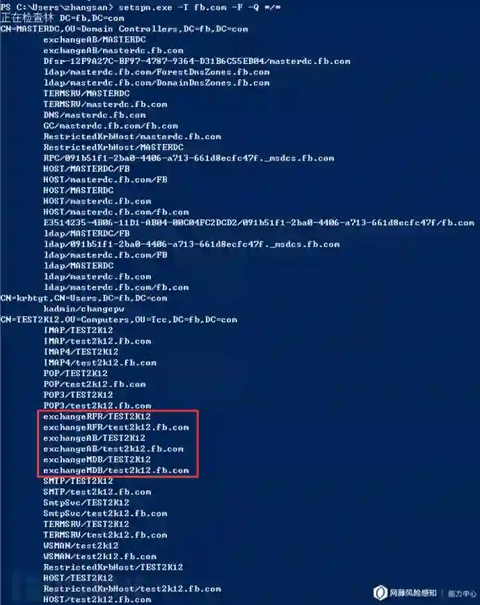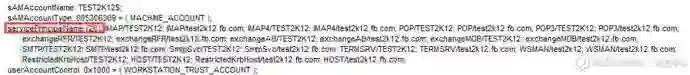 在活动目录数据库中,每一个计算机对象有一个属性名为servicePrincipalName,该属性的值是一个列表,存储着该计算机启用Kerberos认证的每一个服务名称。安装在Windows域环境中的Exchange服务同样会接入Kerberos认证,因此,Exchange相关的多个服务,应该都可以从该属性中找到对应的SPN。