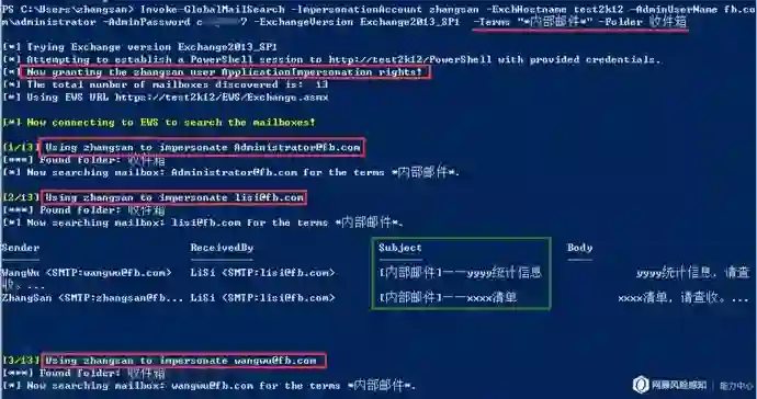 Invoke-GlobalMailSearch -ImpersonationAccount zhangsan -ExchHostname test2k12 -AdminUserName fb.com\administrator -ExchangeVersion Exchange2013_SP1 -Term "*内部邮件*" -Folder 收件箱