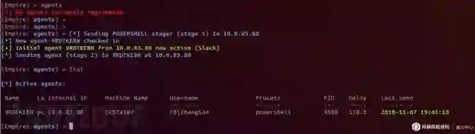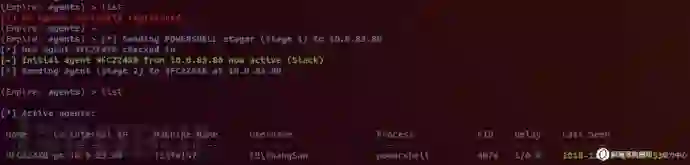 使用empire生成powershell一句话木马,通过Web服务器托管包含该一句话木马的恶意网页。