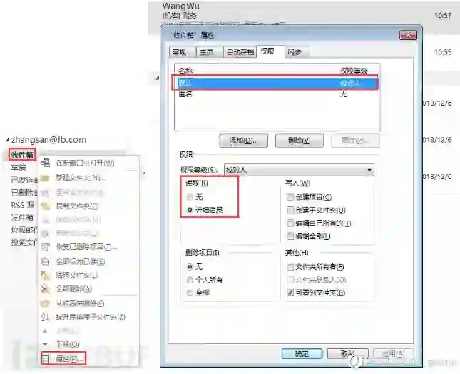 邮箱用户可以通过Outlook设置自己邮箱各个文件夹的权限,通过权限设置可以委派给其他用户访问邮箱文件夹的权限,默认情况下存在两条访问规则,分别是默认规则和匿名规则,但其权限等级都为“无”。如果用户通过该属性设置了邮箱文件夹(如收件箱、发件箱等)的委派权限给其他用户,但权限委派过于宽泛时,可能导致攻击者利用有权限的用户,间接获得目标邮箱用户的邮件访问权。如下,用户zhangsan@fb.com设置了默认所有人对收件箱具有读取的权限。