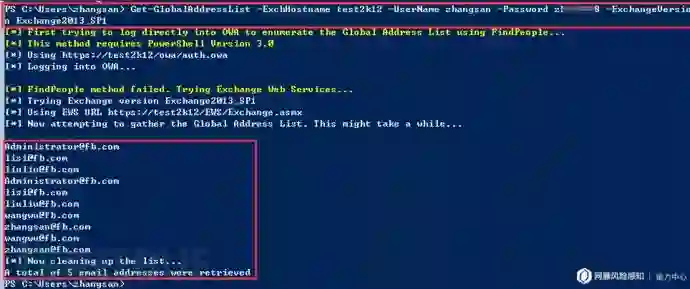 利用已掌握的合法邮箱凭证,可以利用OWA或者EWS接口查询获取到Exchange组织中所有的邮箱用户的邮件地址,即全局地址列表。