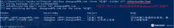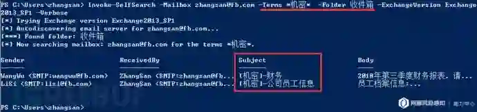 Invoke-SelfSearch -Mailbox zhangsan@fb.com -Terms *机密* -Folder 收件箱 -ExchangeVersion Exchange2013_SP1