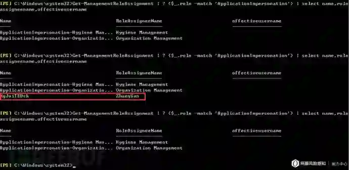 利用已掌握的Exchange最高权限组成员用户,为普通用户分配ApplicationImpersonation角色,使得该普通用户可以以当前用户身份合法伪装其他邮箱用户,进而获得查询所有邮箱用户邮件的权限。更多关于ApplicationImpersonation role,可以查看 链接。
