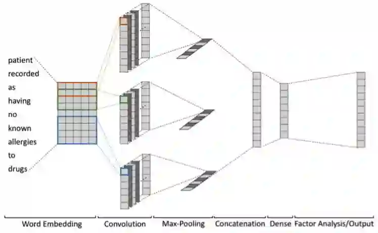 为了同时实现这两个目标,我们开发了一种基于卷积神经网络(CNN)的模型。从高层面看,该模型:1)使用了多个堆叠的隐藏单元层来获取输入记录的隐含语义;2) 使用了不同窗口大小的卷积算子来获取 n-gram 中存在的局部语义和序列结构;3) 可发现常见的隐含因子,从而学习得到药物之间的药理相关性。