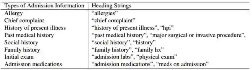 表 1:左栏显示 8 种就诊时可用的信息类型,右栏每行显示了 MIMIC-III 中对应的提取此类信息的标题字符串