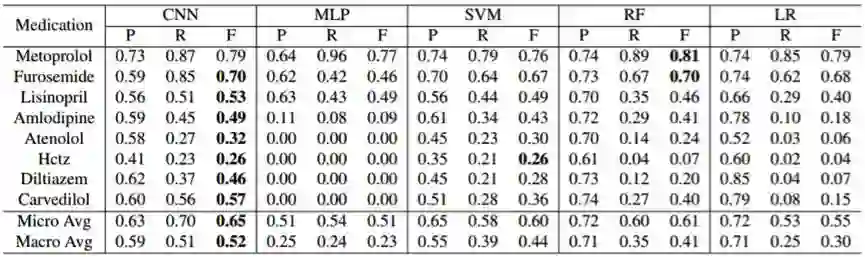 从宏平均和微平均两种 F1 分数上来看,CNN 有远高于其他所有基准模型的准确率。在两种平均 F1 分数之间,CNN 在宏平均上的提升更为显著。CNN 在 7 种药物上都得到了最好的 F1 分数。呋塞米是唯一的例外,其中随机森林(RF)的表现优于 CNN。CNN 相对于基准的提升主要体现在召回率(recall)上,而其准确率则与基准模型相当。在各类基准模型中,只使用就诊药物作为输入的 多层感知机(MLP)在宏平均和微平均 F1 上的表现最差;另外,非线性支撑向量机(SVM)和 RF 的表现优于线性的逻辑回归模型(LR)。