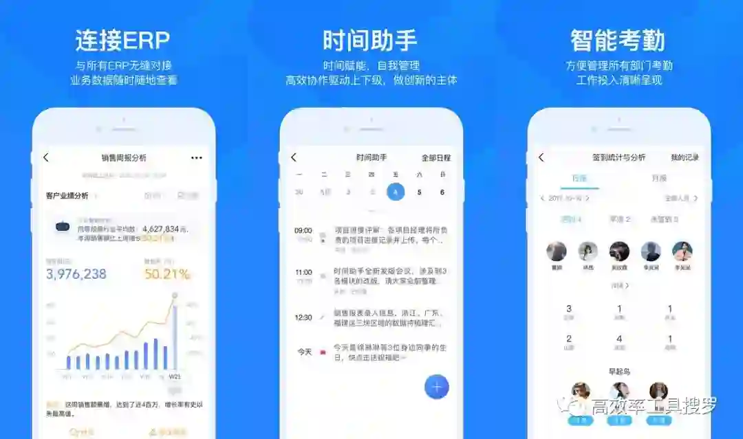 你可以把它当做时间助手,还有连接ERP 的报表。同时文件管理,审批,签到等功能。