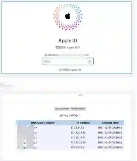 例如,在下面的截图中,攻击者将构造的字符串作为用户名来登录 iCloud 账户。显然,这个字符串进入了 iCloud 服务器的日志中,进而触发漏洞,访问了字符串中所包含的域名: