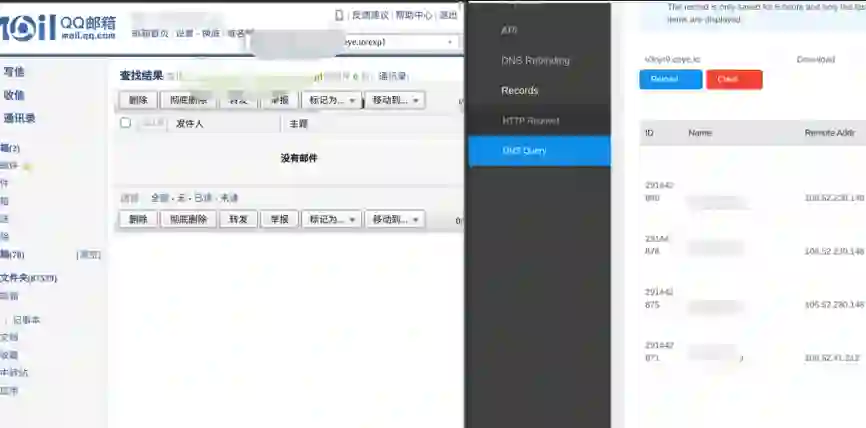类似地,在下面的 QQ 邮箱截图中,攻击者将构造的字符串填进了邮箱的搜索框,同样导致了腾讯服务器被记录:
