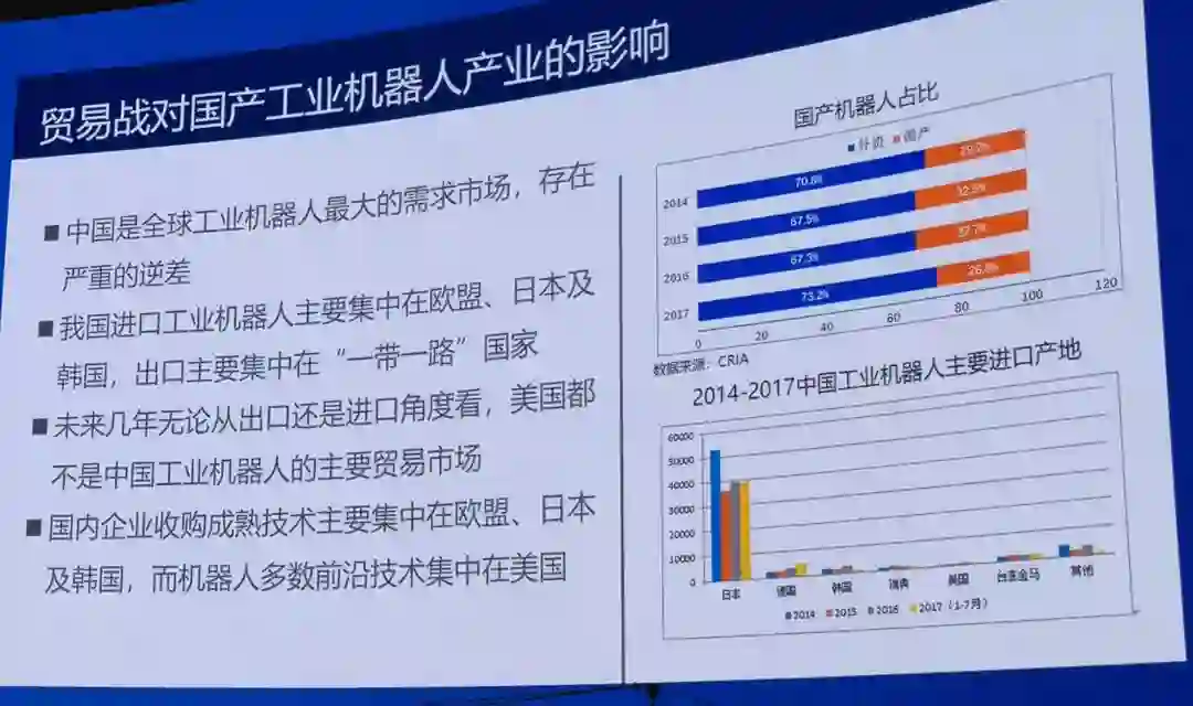 在谈及贸易战对国产工业机器人产业的影响时,赵杰教授谈到,中国是全球工业机器人最大的需求市场,存在严重的逆差。我国进口工业机器人主要集中在欧盟、日本及韩国,出口主要集中在“一带一路”国家。