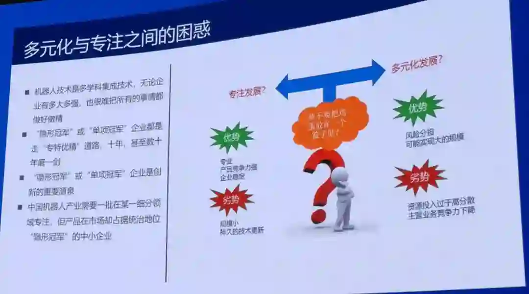 再就是专注与多元化,机器人是多学科集成技术,无论企业做得多大也很难把所有的事情全做完或者全包在自己手里。