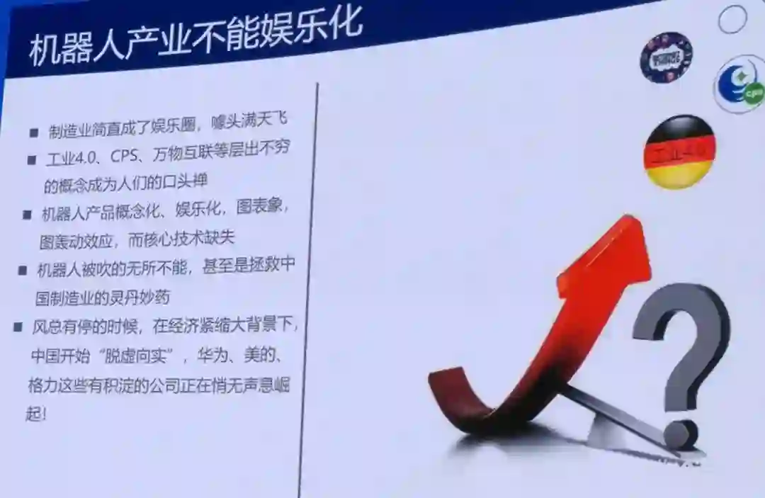现在好像不讲工业4.0和万物互联,就好像是很落后的人,并不是这样。机器人产品出现一些概念化、娱乐化、图表化,很多都是图轰动效应,核心技术是有缺失的。