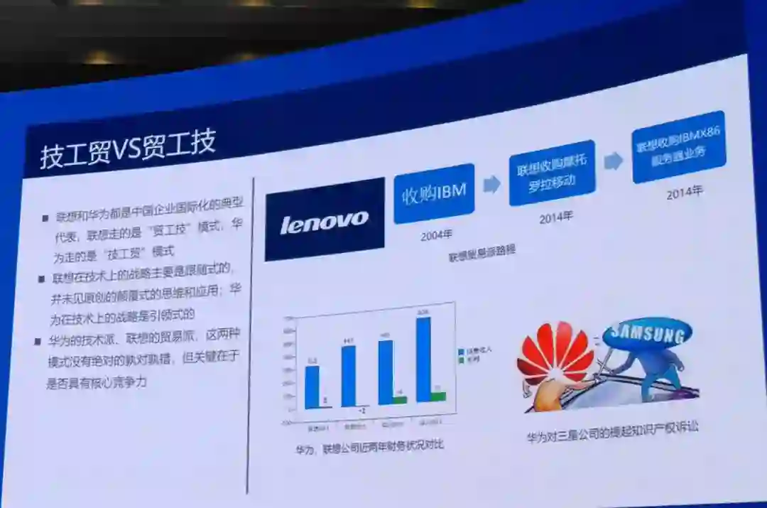 现在我们有大量的企业到国外合资并购,实际上中国开放几十年,以联想和华为为代表的两个流派分别叫做“贸工技”与“技工贸”,联想是“贸工技”,华为是“技工贸”。