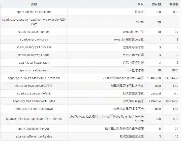 A:调优参数虽名目多样,但最终目的是提高CPU利用率,降低带宽IO,提高缓存命中率,减少数据落盘。 (以下参数主要用于Spark Thriftserver,仅供参考)