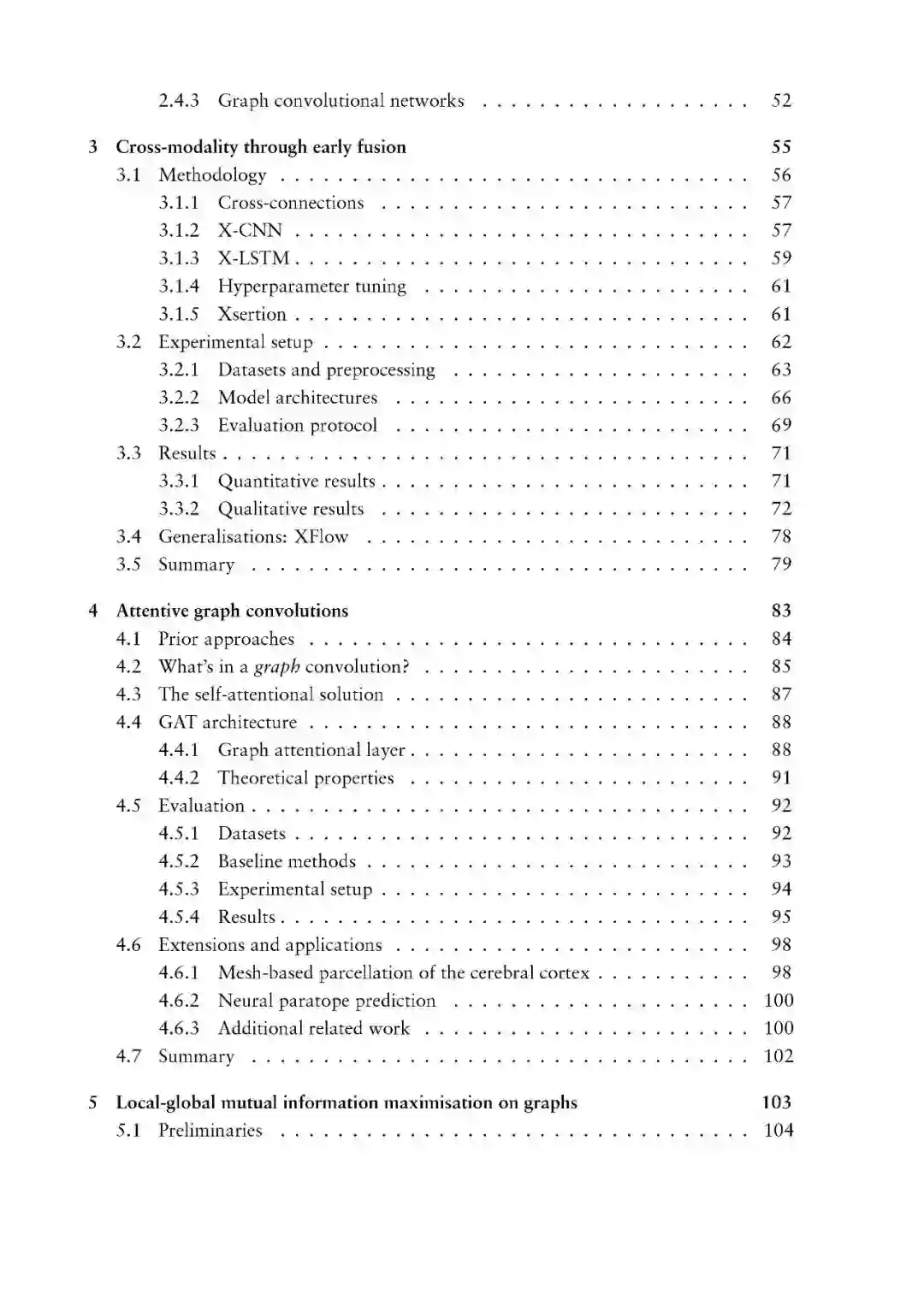本文主要贡献的概述。首先,提出了两种具有特殊结构诱导偏差的多模态学习早期融合模型;一个用于网格结构输入模式(X‐CNN[176]),另一个用于顺序输入模式(X‐LSTM[177])。接下来,图卷积层的理想结构偏差在图注意力网络(GAT[174])模型中得到了应用,并且第一次同时得到了满意的结果。最后,通过Deep Graph Infomax (DGI[175])算法成功地引入了局部互信息最大化,将其作为一个无监督学习目标用于图的结构输入,允许在学习节点表示时结合图卷积编码器引入非常强大的结构诱导偏差。