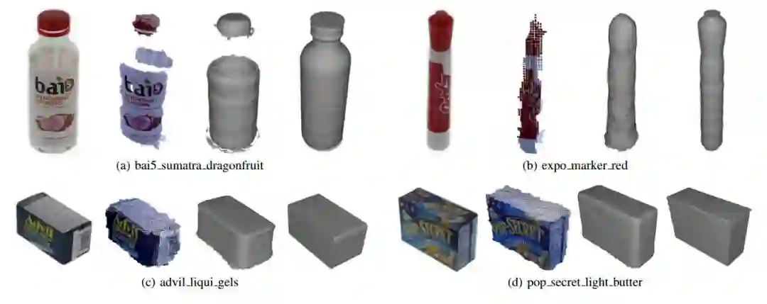 图5:从BigBIRD数据集中提取的样本对象。在每个物体组中,第一列是目标物体的RGB图像。第二列是对象的原始点云。第三列是由BigBIRD数据集提供的地面真值网格。第四列是使用我们的系统建模的对象。请参阅附带的视频和补充材料,以获得我们完整提取的数据。