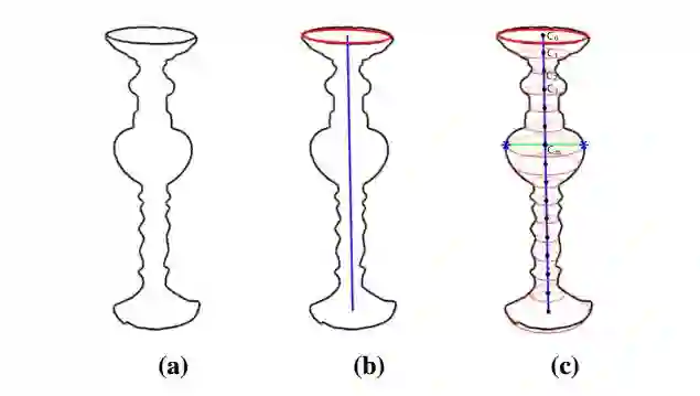 图3:建模广义圆柱体。(a)用户追踪的轮廓;(b)中提取物体的轮廓和中心线;(c)沿着物体中心线按一定的时间间隔传播和按比例调整轮廓。每个Ci表示沿着中心线的复制剖面的中心。复制的轮廓按照比例缩放,这样它们就可以在星号表示的点上贴合用户的笔画