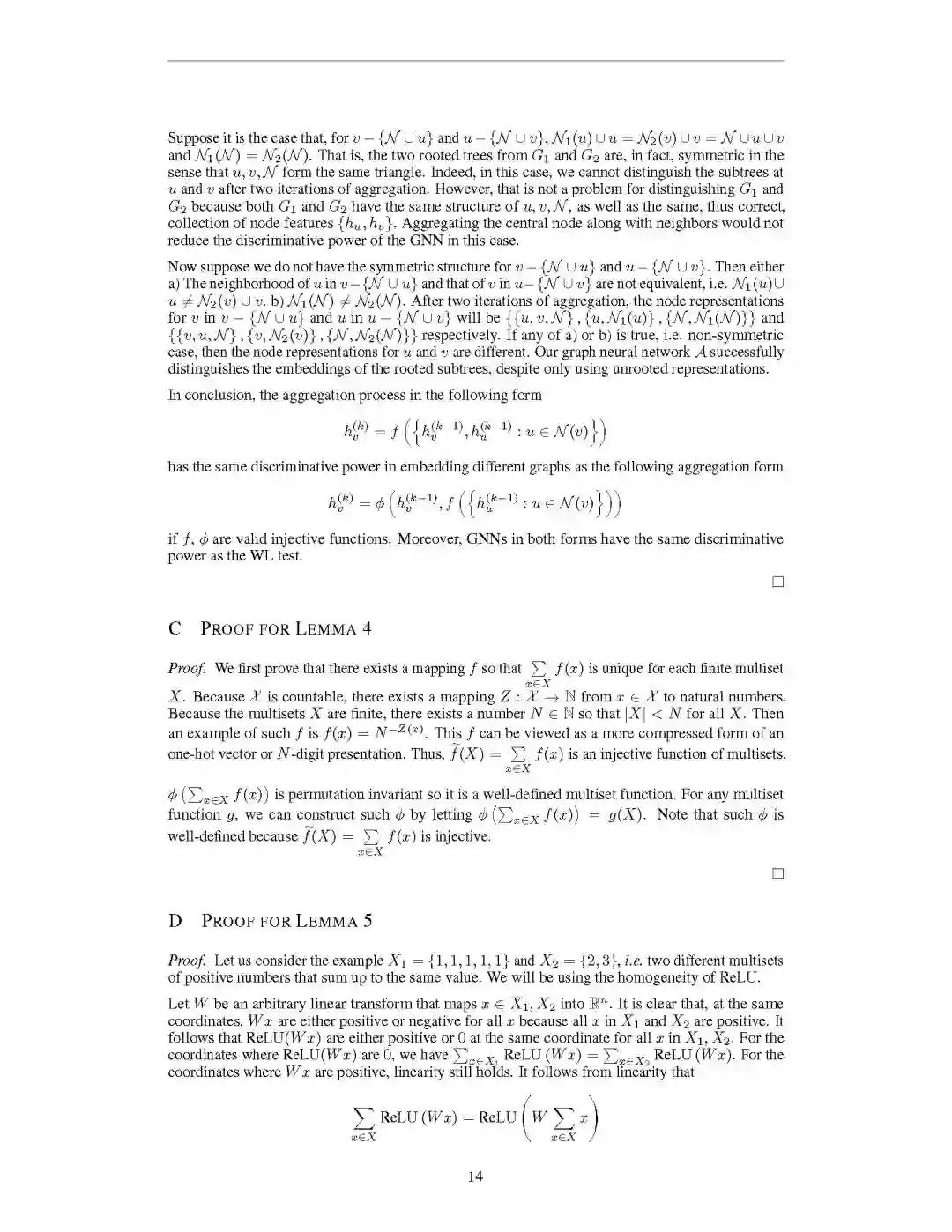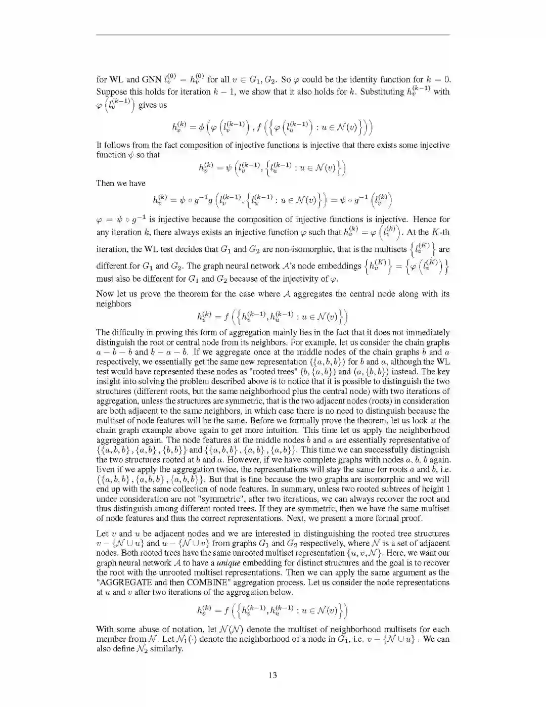 在这里,论文提出了一个理论框架来分析GNN的表征能力。 正式地描述了不同的GNN变体在学习表示和区分不同的图结构时是如何表达的。 提出的框架受到GNN与Weisfeiler-Lehman(WL)graph isomorphism test(Weisfeiler&Lehman,1968)之间密切联系的启发,这是一个用来区分一部分图类强有力的检测(Babai & Kucera, 1979)。 与GNN类似,WL测试通过聚合其网络邻居的特征向量来迭代地更新给定节点的特征向量。 使WL test如此强大的原因在于其内射(or 单射)聚合更新将不同的节点邻域映射到不同的特征向量。 我们的主要观点是,如果GNN的聚合方案具有高度表达性并且可以模拟内射函数,那么GNN可以具有和WL test一样强大的判别力。