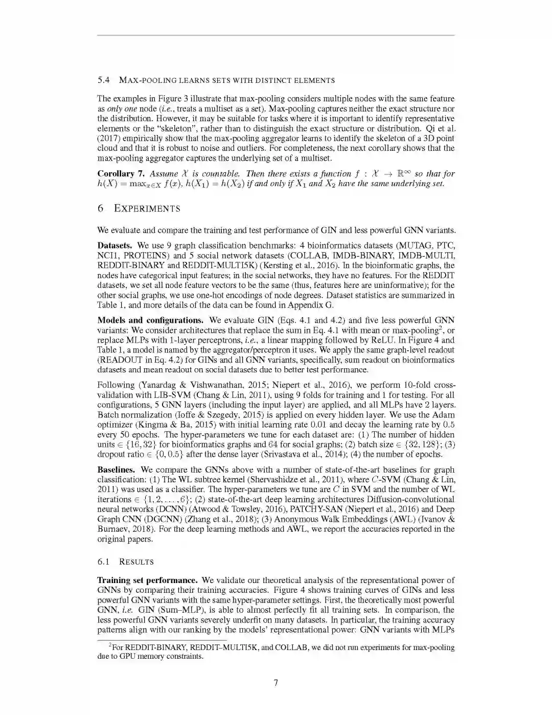 论文通过图分类数据集上的实验来验证提出的理论,其中GNN的表达能力对于捕获图结构至关重要。特别是,将GNN的性能与各种聚合函数进行比较。结果证实,最强大的GNN(图同构网络(GIN))具有很高的表示能力,因为它几乎完全适合训练数据,而较弱的GNN变体往往严重不适合训练数据。此外,表示性能更强大的GNN通过测试集精度优于其他GNN,并在许多图分类基准上实现最优异的性能。