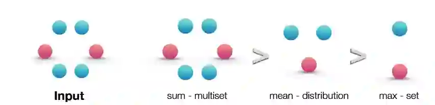 为了从数学上形式化上述观点,我们的框架首先将节点邻居的特征向量抽象为多集(multiset),即可能包含重复元素的集合。然后, GNN中的邻居聚合可以被抽象为多集上的函数。我们严格研究多集函数的不同变体,并从理论上刻画了它们的判别能力,即不同聚合函数如何区分不同的多集合。多集函数越具有判别性,底层GNN的表征能力就越强大。