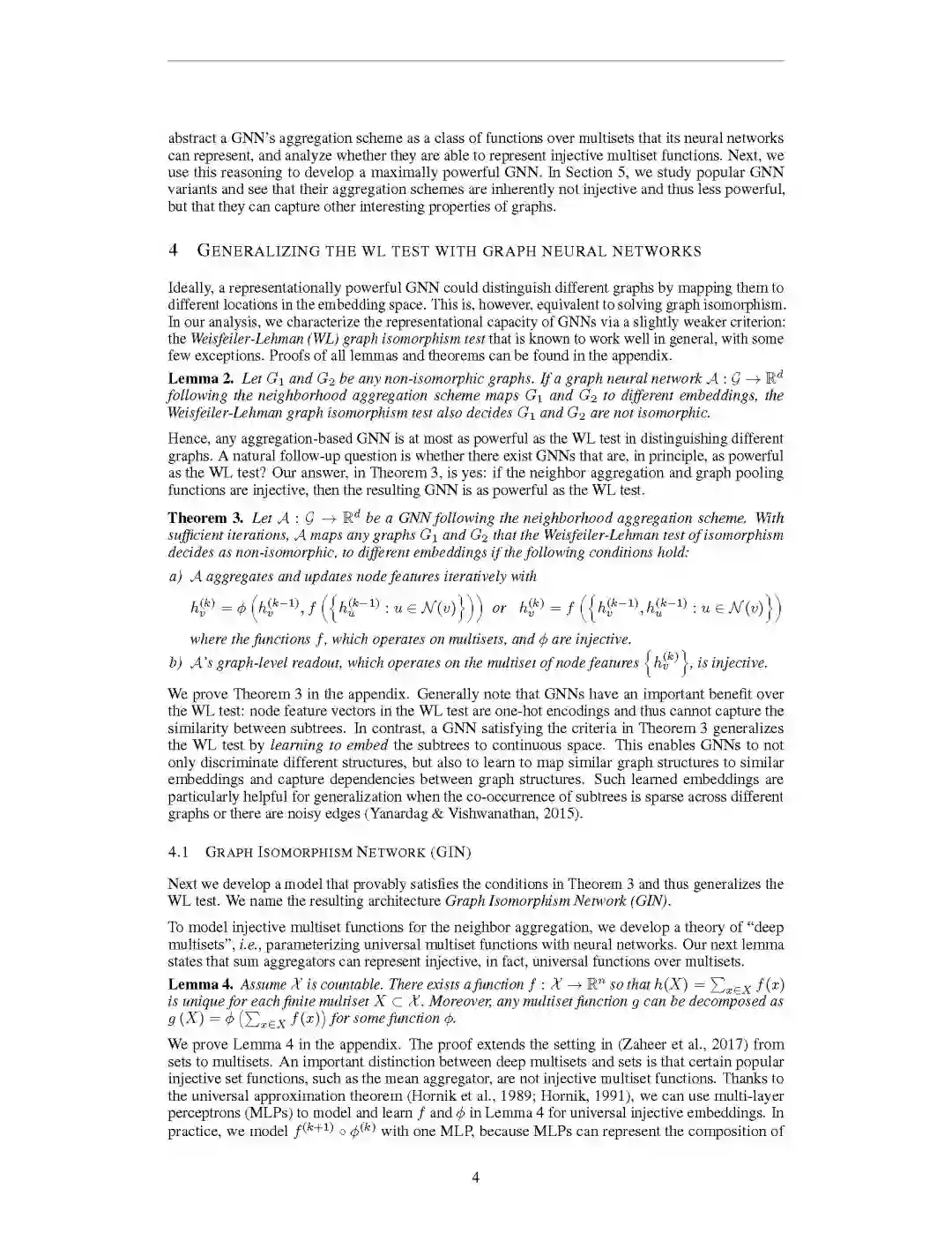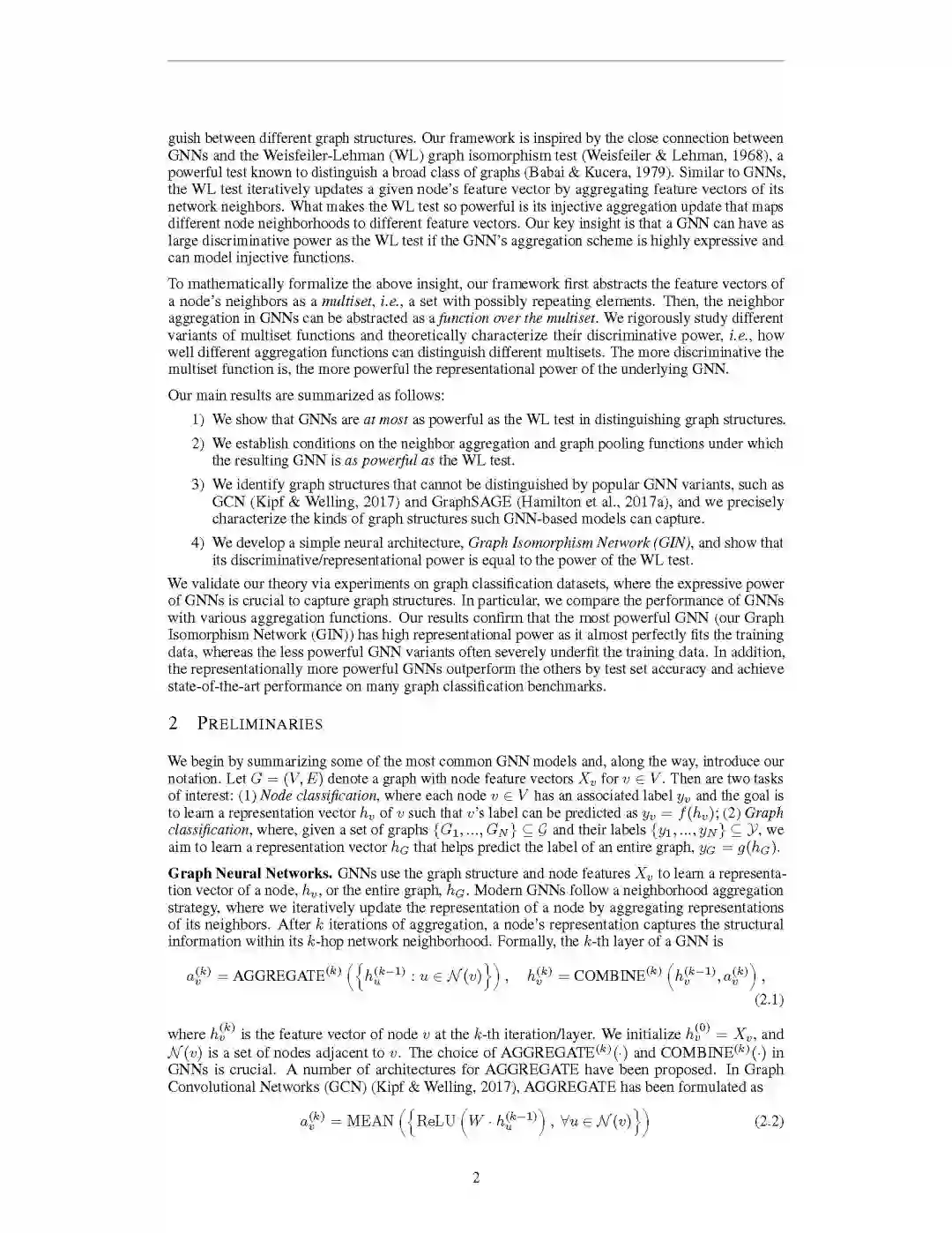 开发了一个简单的神经结构——图同构网络(Graph Isomorphism Network, GIN),并表明它的判别/表征能力等于WL test的功效。