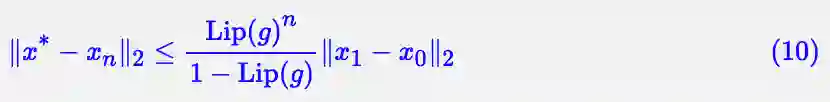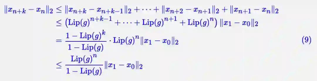 换句话说,如果迭代 (5) 收敛,那么收敛的结果就是 x+g(x) 的逆函数。所以我们只需要搞清楚 (5) 什么时候收敛。这时候前面的条件 Lip(g)<1 就能用上了,我们有: