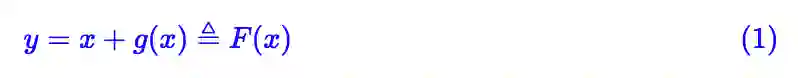 假如 y=x+g(x) 是可逆的,那么我们要想办法求出逆函数 x=h(y),这其实就是解一个非线性方程组。简单起见,我们考虑迭代: