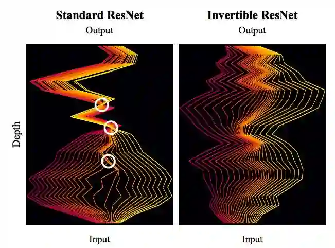 ▲ 标准ResNet与可逆ResNet对比图。可逆ResNet允许信息无损可逆流动,而标准ResNet在某处则存在“坍缩”现象。