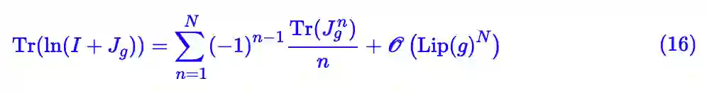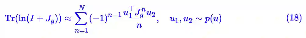 所以,最终可以总结为:将雅可比矩阵做对数级数展开 (15),然后将行列式计算转化为迹的计算 (16),并且利用概率采样的方式 (18),就可以最高效地计算雅可比行列式。