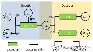 我们借助于循环神经网络来实现这种转换,对于时空建模而言,输入:已观测的事件序列,输出:下一事件。输入和输出的形式都是事件,循环神经网络的作用是将输入进行编码,继而再做解码还原为事件描述输出。由于需要统一时间和空间,人为的方式难以定义这种编解码的过程,因此藉以能够通过循环神经网络去寻找。图1展示了一个利用循环神经网络对时空建模的基本框架:左侧为编码过程,右侧为解码过程。图中的t,e分别表示时间和空间变量,在编码前,我们预先对时间和空间进行Φ(t)和φ (e)转换,使之能够作为神经网络的输入;编码过程的输出,我们称为表达h,作为解码过程的输入,通过函数s和r做解码变换确定下一可能发生的事件。可以发现,表达h是连接编解码过程的关键,是统一时间和空间的一结果。