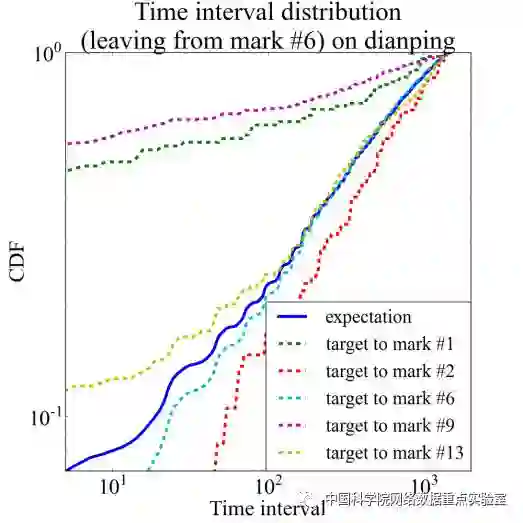 利用图1所提的框架解决了时空建模过程中时空异质问题,其在部分应用问题上也得到了证实。但我们发现上述解码过程存在一个问题,时间和空间变量是单独解码的,这种独立解码的方式会在解码过程中损失一定的精度,导致对事件的描述不够准确。还是以购物为例,假设有两个人分别在北京西单大悦城购物,其中一个人逛完上场完之后坐上地铁去了簋街小吃街,而另外一人则去了位于西单的首都电影院打算去看一场电影。根据地图显示,从大悦城去簋街需要35分钟左右的时间,而去首都电影院只需要坐上电梯,花上大约3-5分钟的时间就可以。可以看到,时间消耗和目的地有明确的关系,而独立解码则会忽略两者之间的关联性。在真实数据中,这种情况又常见么?接下来我们对大众点评中团购频道的数据进行了统计,用以说明我们不能忽视这种时空存在关联的现象。图2是数据的统计结果,我们选择了某一特定店铺,在线团购中,用户在该店铺进行消费后,我们观测他们的下一消费选择会如何变化。图中枚举了5家用户后续经常选择的店铺,可以看到,不同的选择所消耗的时间会存在明显差异。假如,我们采用之前独立解码的方式,那么最后拟合出来的结果会如图2中实线部分所示,这显然不是我们想要的结果。