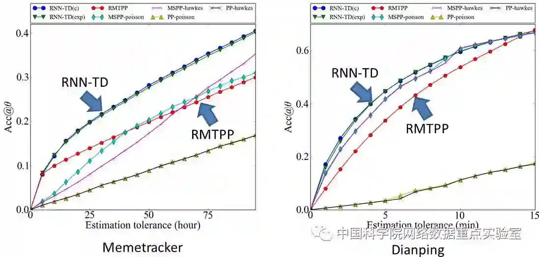 我们在两个实验数据集上比较前后两种框架的差异性:一组为用户博客数据(Memetracker),一组为大众点评的团购消费数据(Dianping)。我们分别采用两种框架用来预测下一事件的发生时间,并将其精度展示于图4中。可以看到,考虑解码过程中时间和空间关联关系的后一种框架(RNN-TD),其在预测精度上优于不考虑这种关联关系进行解码的框架(RMTPP)。也就是说,这条增加的连接关系是确实有效的。