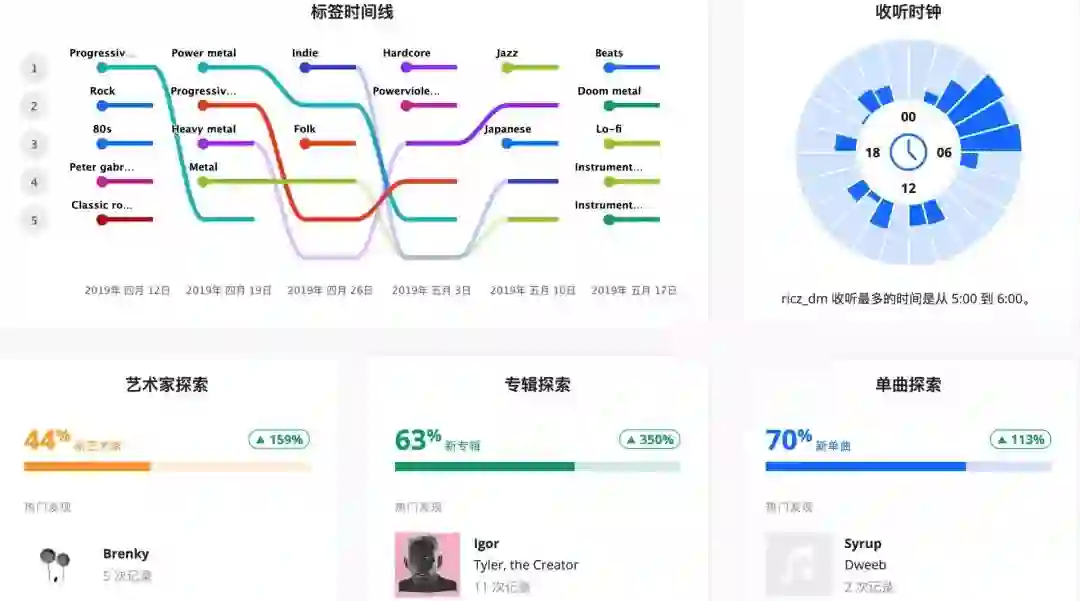 其他用户可以通过该用户个人主页所呈现出的数据,完整的了解到Ta的音乐喜好、习惯,从而进一步增加互动的可能性。