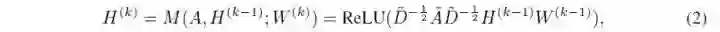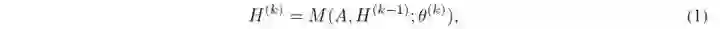 其中 k 表示第 k 次信息传递, 为相应神经网络的参数。在第一次信息传递中,H 就是输入的原始节点特征矩阵 X;在最后一次信息传递中,相应的 H 就作为 Z 输出。比较著名的 GCN 算法的信息传递公式可以写为