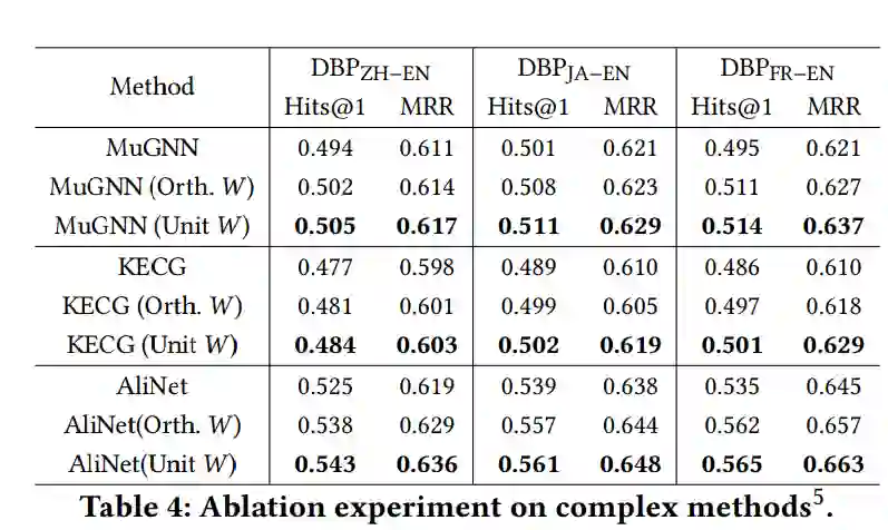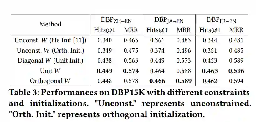 其中ei与ej是一对已知对齐,h表示对应实体的向量,为了保留转换中的不变性,W被约束为一个正交矩阵。