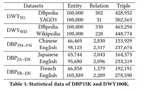 实验使用的语料是DWY100K及DBP15K,统计信息如下:
