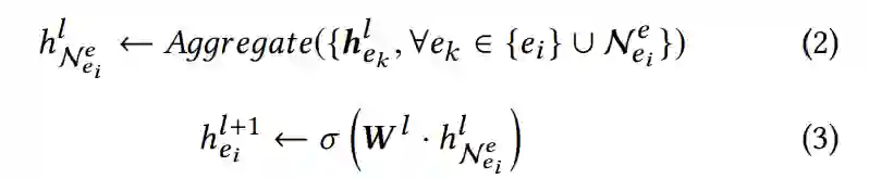 N表示实体e周围的邻,W则是l层的转换矩阵,公式2用于将实体邻居的信息聚合,而公式3用于将实体的embedding转换为一个更佳的版本。有许多的操作可以实现聚合的目的(例如normalized mean pooling或者attentional weighted summation)。