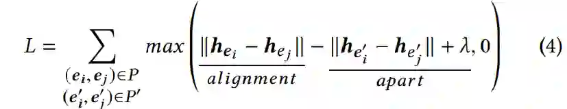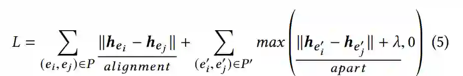 在得到embedding之后,GNN方法一般会构建如下损失使得对等实体更加接近对方,其中带有” ’ ”的为负例样本(随机替换正例样本中的实体得到)。