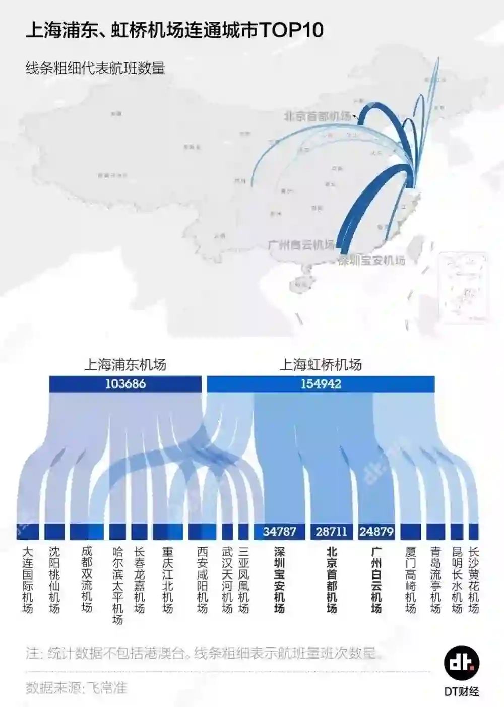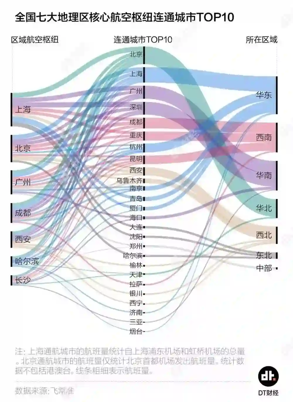 站在城市研究的视角,机场吞吐量和航线通达情况一定程度上代表城市商旅活动的活跃程度,进而与城市首位度和经济势能挂钩。DT财经尝试梳理航线与客流相关数据,以此作为描绘中国区域与城市发展立体图景的一个切面,推出系列报道。这是系列的第一篇,我们将告诉你,在航线纵横连接的网络中,哪些城市与城市群机场拥有更高的枢纽地位。