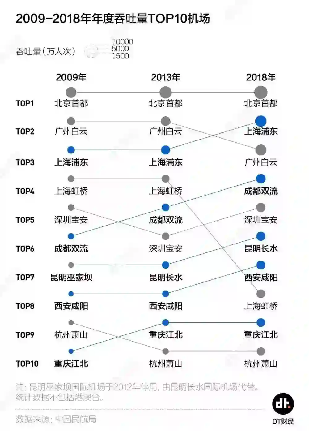 如果以吞吐量来粗论城市的江湖地位,那么过去十年顶级大佬的圈层并没有发生什么变化。2018年的年度吞吐量TOP 10机场仍旧与2009年一样,一线城市北上广深占去5席,西部的成都、昆明、西安与重庆4城稳中有升,仅余末位落到了杭州。