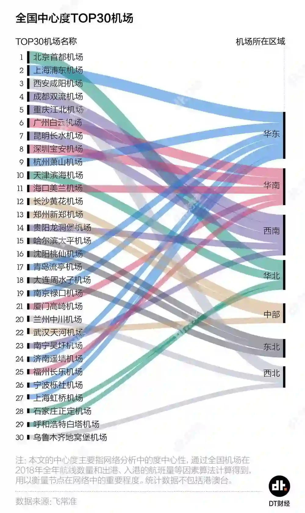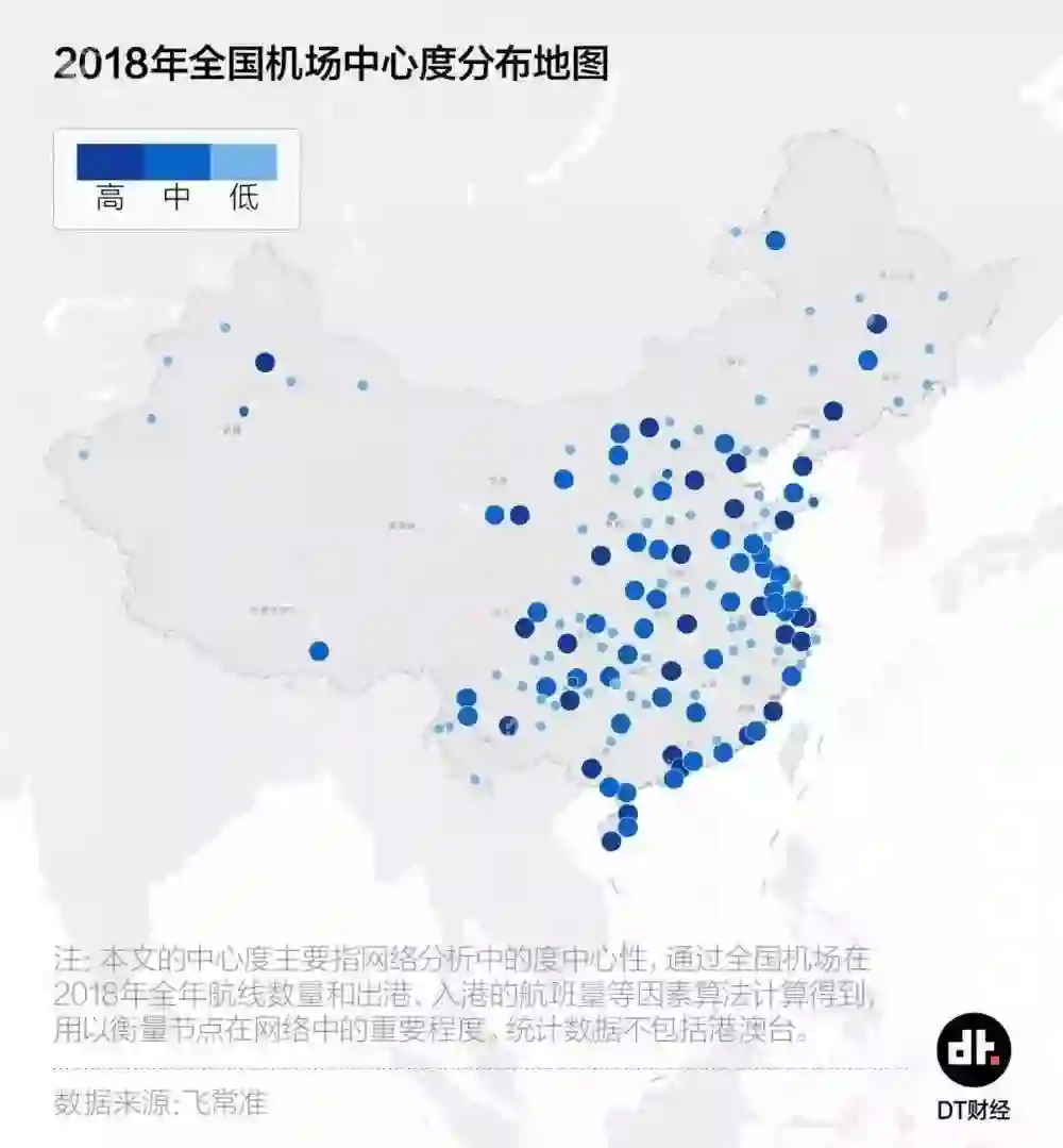为了科学答题,DT君借用了网络分析中的中心度概念。中心度考量一个网络中各个节点的重要程度和核心性,通过量化节点之间的关系计算得出。与此相对应,机场就是一个个节点,通过航线的交织联系形成了一个航空网络。我们综合考虑了2018年各机场间的航线数量、进港出港航班数量等数据,通过算法计算得到每个机场的中心度。
