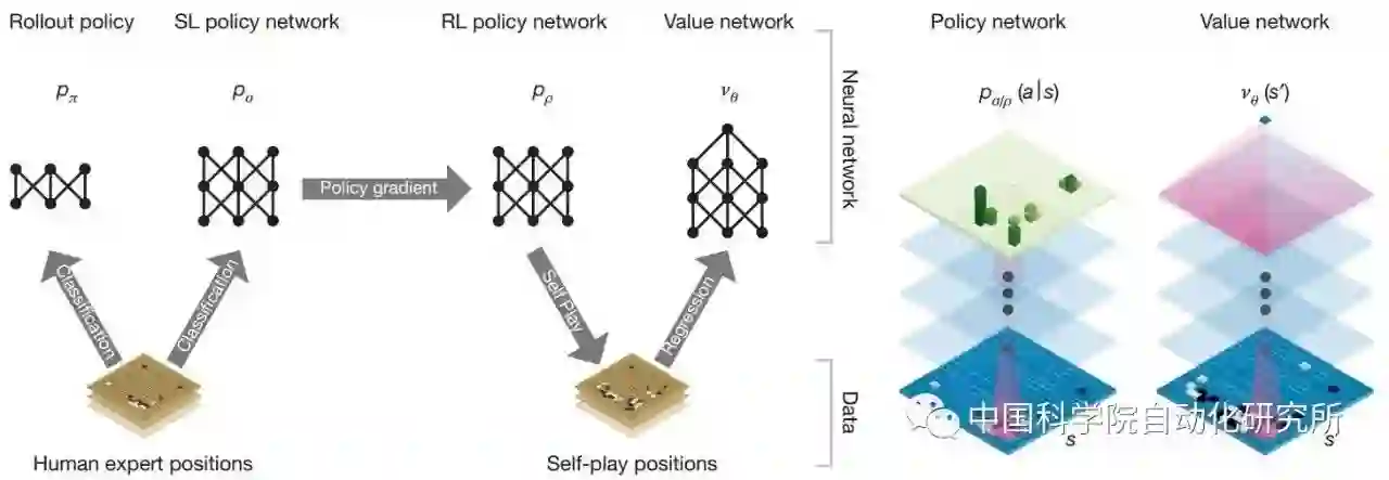 AlphaGo Zero的出现,再一次引发了各界对深度强化学习方法和围棋AI的关注与讨论。AlphaGoFan和AlphaGo Lee都采用了两个神经网络的结构,如图6所示。其中策略网络初始是基于人类专业棋手数据采用监督学习的方式进行训练,然后利用策略梯度强化学习方法进行能力提升。在训练过程中,深度神经网络与蒙特卡洛树搜索方法相结合形成树搜索模型,本质上是使用神经网络方法对树搜索空间的优化。
