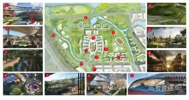 校园总平面规划包括六大组团,分别为行政办公组团、教学科研组团、图书馆和学生中心组团、会堂和学术交流组团、住宿和生活组团、体育运动组团及后勤和附属设施。